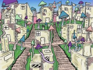 A recurring element in those illustrations are Fungi. Considering its recent emergence in many scientific domains, ranging from trauma healing to waste treatment, my intuition can’t help but have the feeling that it can play an important role in connecting the urban with nature.